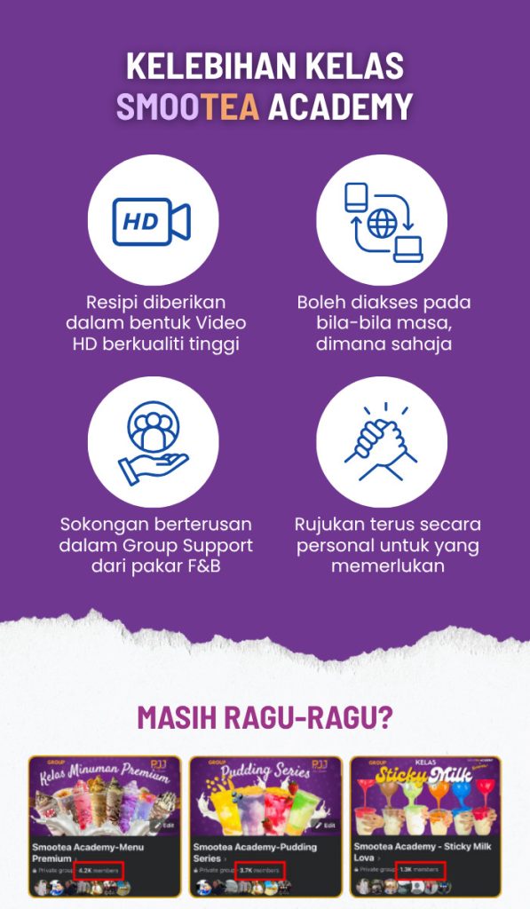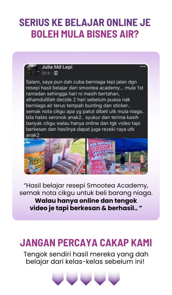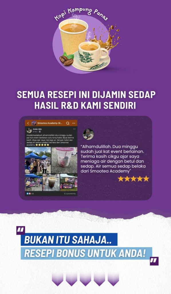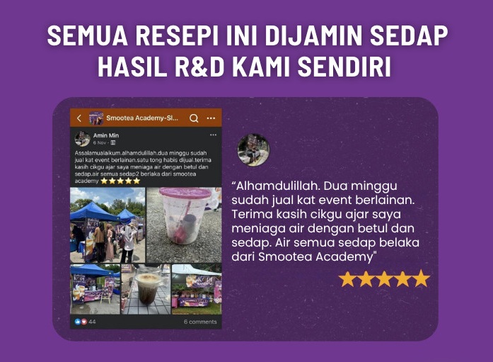 Dalam kelas ini, Kami Bukan sekadar Mengajar resepi, kami juga akan berikan tips penting untuk bantu anda mulakan bisnes minuman ini & kekal konsisten sehingga berjaya!